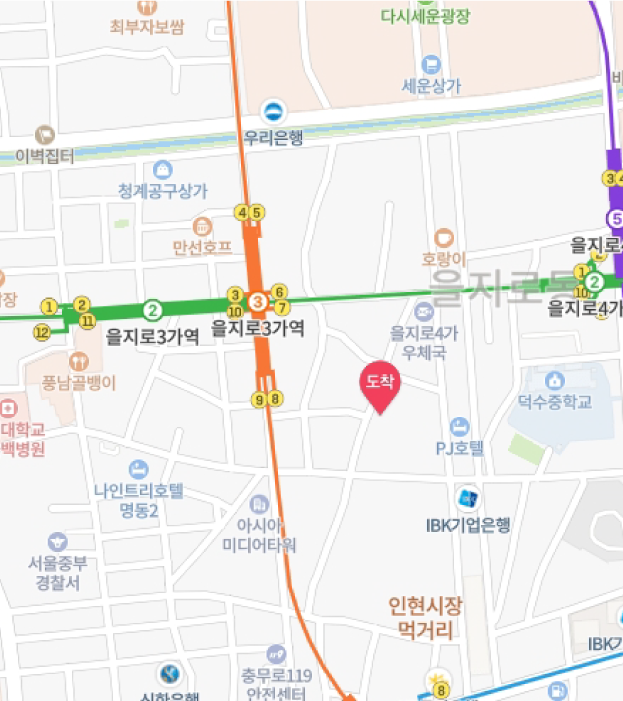 [Line 2, Line 3] Exit 8 of Euljiro 3-ga Station, turn left at Myeongbo Theater